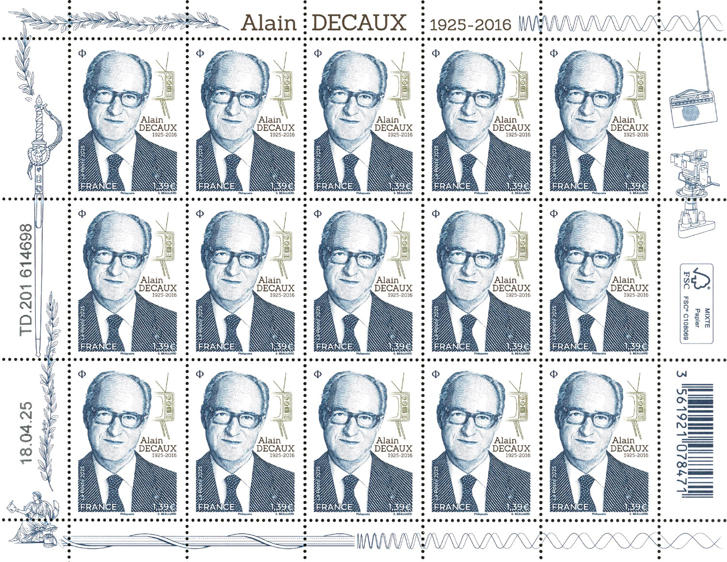 Le timbre est un hommage à celui que l’on considère comme le pionnier des programmes historiques dans les médias. Depuis l’adolescence, Alain Decaux se passionne pour l’Histoire. Après des études de droit, il s’oriente vers le journalisme et l’écriture. Son second livre d’histoire, Letizia : Napoléon et sa mère, est récompensé par le prix d’histoire de l’Académie française. C’est avec André Castelot qu’il crée en 1951 pour la radio, à Paris-Inter puis à France-Inter, l’émission La Tribune de l’Histoire.