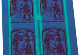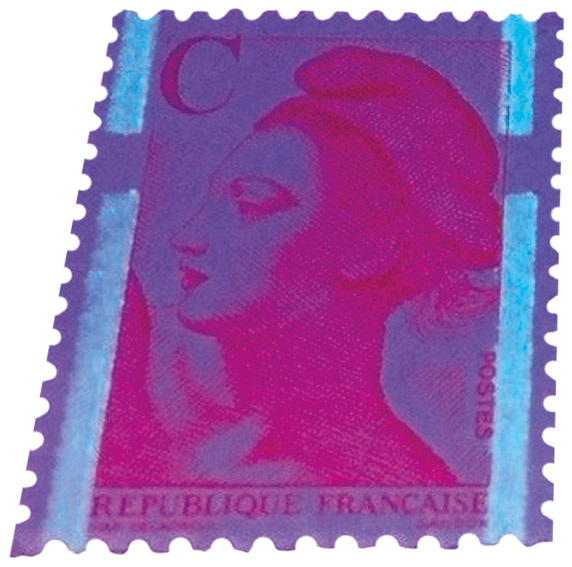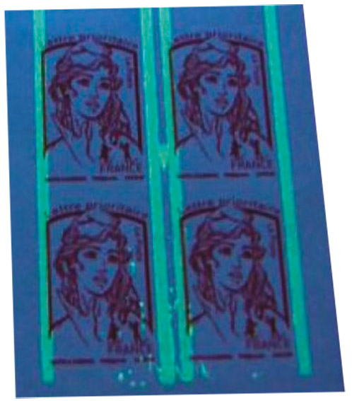• Décalages plus ou moins importants des bandes. Ils sont dus à la désynchronisation entre les blocs imprimant ; celui de l’effigie et celui des bandes phosphorescentes (13).  Ces décalages font le bonheur des variétistes par leur côté spectaculaire. Cela dit, ils sont sans importance pour le fonctionnement des discriminatrices à la condition qu’il y ait bien deux bandes d’imprimées afin d’éviter le déclassement du courrier urgent. Les déplacements latéraux suite à un glissement de gauche à droite (ou l’inverse) sont plus rares. S’agissant de timbres à usage courant imprimés en grande quantité, ces variétés sont à prendre en considération lorsqu’elles sont relativement importantes (par exemple, les décalages verticaux doivent concerner plus d’un tiers de la dimension du timbre).