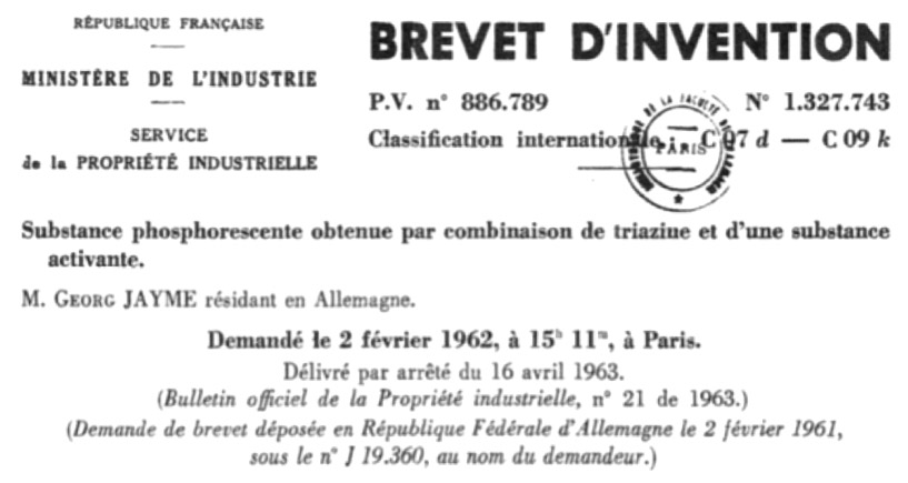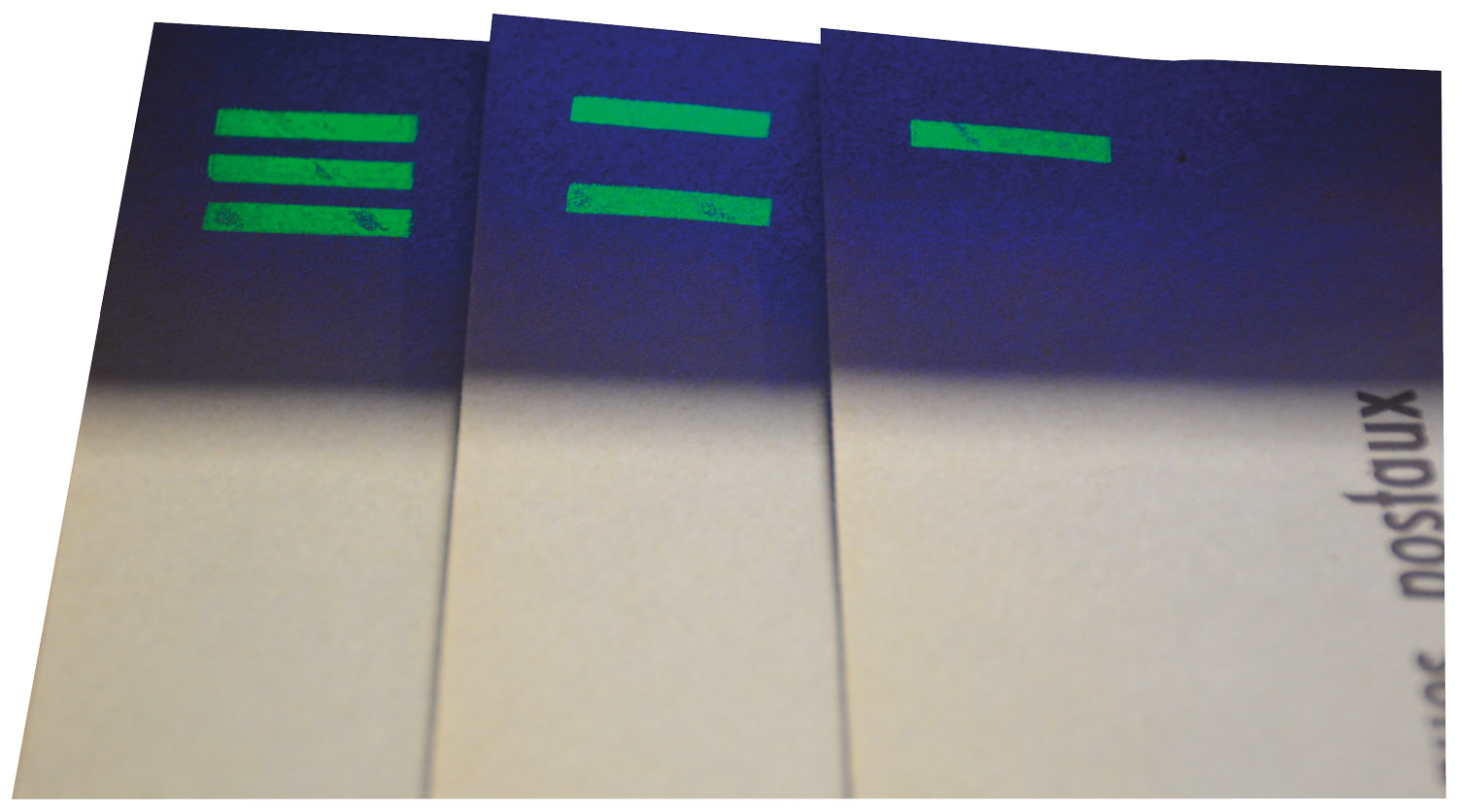 Il prévoit également qu’elles ne doivent pas être perceptibles par l’usager à la lumière du jour ! Le pigment incorporé à l’encre doit avoir un comportement essentiellement phosphorescent lorsqu’il est excité par une lumière UV. L’énergie relative d’une période inférieure à 1 milliseconde doit être inférieure à 15 % de l’énergie luminescente totale et continuer à se manifester après que l’excitation ait cessé.  Par exemple, la substance phosphorescente utilisée par la société HELNA devenue SIRAL, est obtenue en combinant un composé de triazine formé en présence d’une substance activante (8).