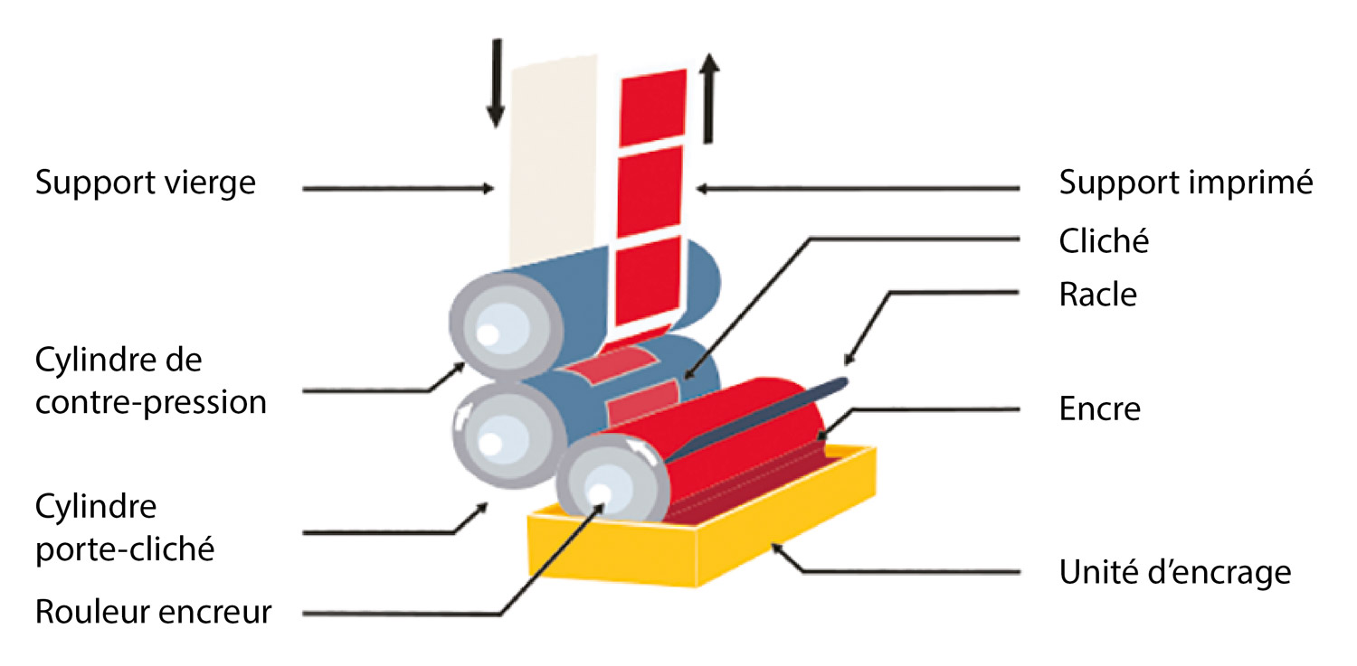 Le concept (1) consiste à déposer l’encre directement sur le support à partir de la forme imprimante en relief, semblable à la typographie, appelée cliché. Les clichés gravés sur une matière souple étaient composés de caoutchouc ou de matière plastique avant l’apparition des plaques photopolymères dans les années 70. Ensuite, les clichés sont fixés magnétiquement ou collés sur un cylindre en acier. Ce sont eux qui portent les empreintes du motif à imprimer.  L’unité d’encrage est généralement faite d’un rouleau encreur tramé ou alvéolé, appelé Anilox, trempant dans un réservoir d’encre et d’une racle permettant d’en enlever l’excédent. Ce cylindre dur dépose l’encre sur le cliché en relief qui transfère alors l’encre sur le support à imprimer grâce à une légère pression appliquée par le cylindre de contre-pression. Le procédé utilise une encre fluide.