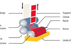 Vous l’aurez compris : la flexographie c’est une affaire de cliché qui fait la différence. En réalité, il n’existe pas de machine spécifique, car les clichés souples sont montés sur un manchon, fixés par aimantation ou collage au néoprène. Le cylindre porte-cliché peut être installé sur n’importe quel bloc imprimant d’une rotative (le remplacement d’un cylindre est de l’ordre du 1/4 d’heure).