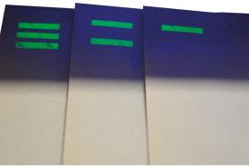 Pour la composition de l’encre des bandes phosphorescentes, la problématique est différente de celle des couvertures de carnets puisqu’il ne s’agit pas à proprement parler d’une encre, mais d’une émulsion dans laquelle on ajoute un ingrédient principal qui produit le phénomène de phosphorescence. Un cahier des charges a été établi à l’origine après de longs essais, très variés, permettant d’avoir un produit stable et performant sur tous les papiers et convenant à tous les types de machines de marquage.